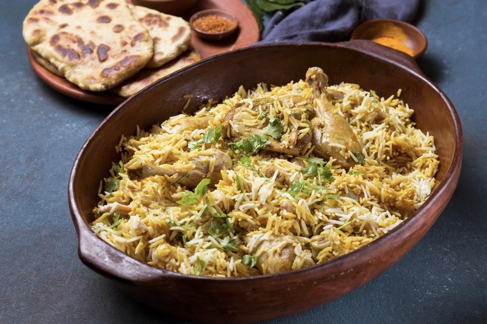 Традиционное блюдо Индии и Пакистана делают из риса басмати с мясом, рыбой, яйцами или овощами и щедро приправляют специями. Рис пропитывают топленым маслом, кумином, гвоздикой, кардамоном, корицей, лавровым листом, имбирем, луком. Список специй варьируется по регионам. В отличие от плова, мясо и рис для бирьяни готовят отдельно, а потом выкладывают слоями.