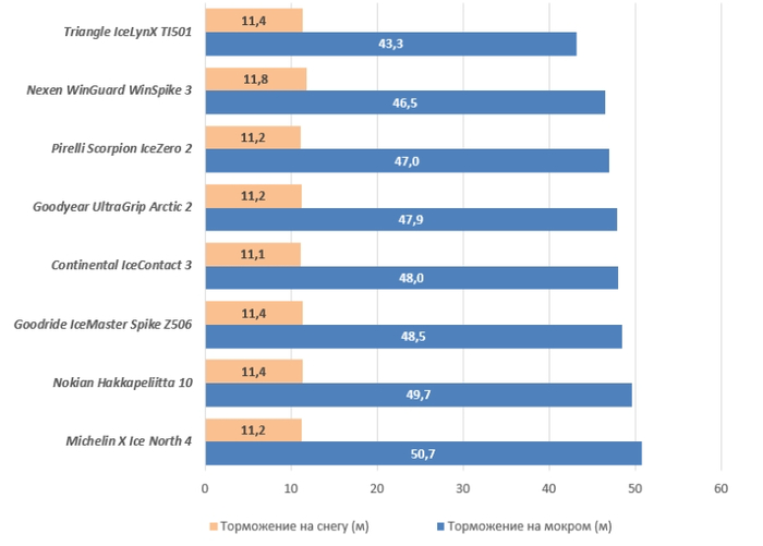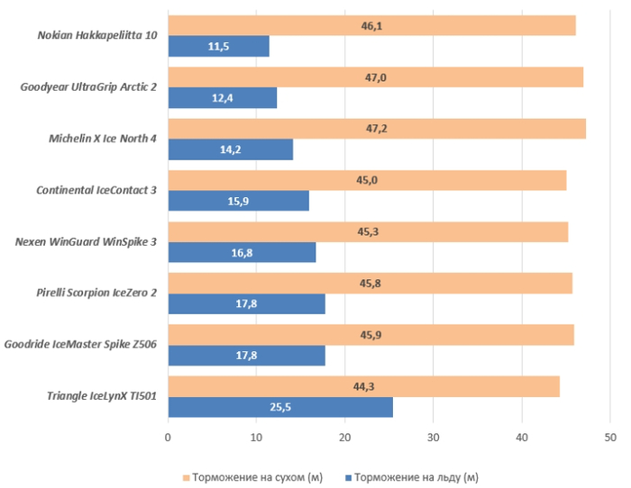 Лидеры на снегу удивили. Nokian Hakkapeliitta 10 на первом месте, хвастунишка Goodyear UltraGrip Arctic 2 на втором, ветеран Michelin X Ice North 4 на третьем. Разрыв между первым и третьим местом на льду почти 3 метра, что уже является огромной разницей. При этом лидер на сухом покрытии показал себя Triangle IceLynX TI501 и он же хуже всех оттормозился на льду. 14 метров (!) разница в тормозному пути на льду между лидером и аутсайдером.