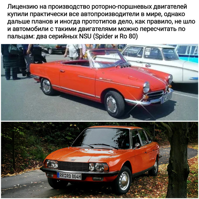 Мотор получился неудачным, ненадежным и прожорливым, и в 1967 году компания NSU выпустила новую модель с доработанным мотором - NSU Ro 80, c литровым двухсекционным РПД, мощностью в 110лс. Но из-за низкого ресурса и частых отзывных компаний NSU обанкротилась и была приобретена ВАГом, который запихнул в Ro 80 обычный фордовский двигатель.