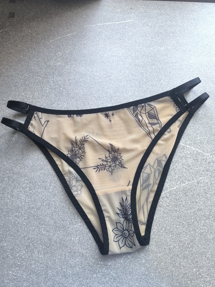Слипы из тату-сетки. В одно время комплекты из этой сетки были очень популярны, особенно в черной отделке. У меня оставался малюсенький кусочек этой сетки. Пришлось пожертвовать центрацией рисунка, чтобы хватило на трусы, что я и озвучила девушке, но ее это не смутило.