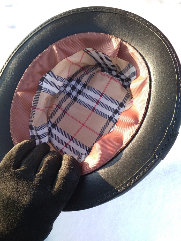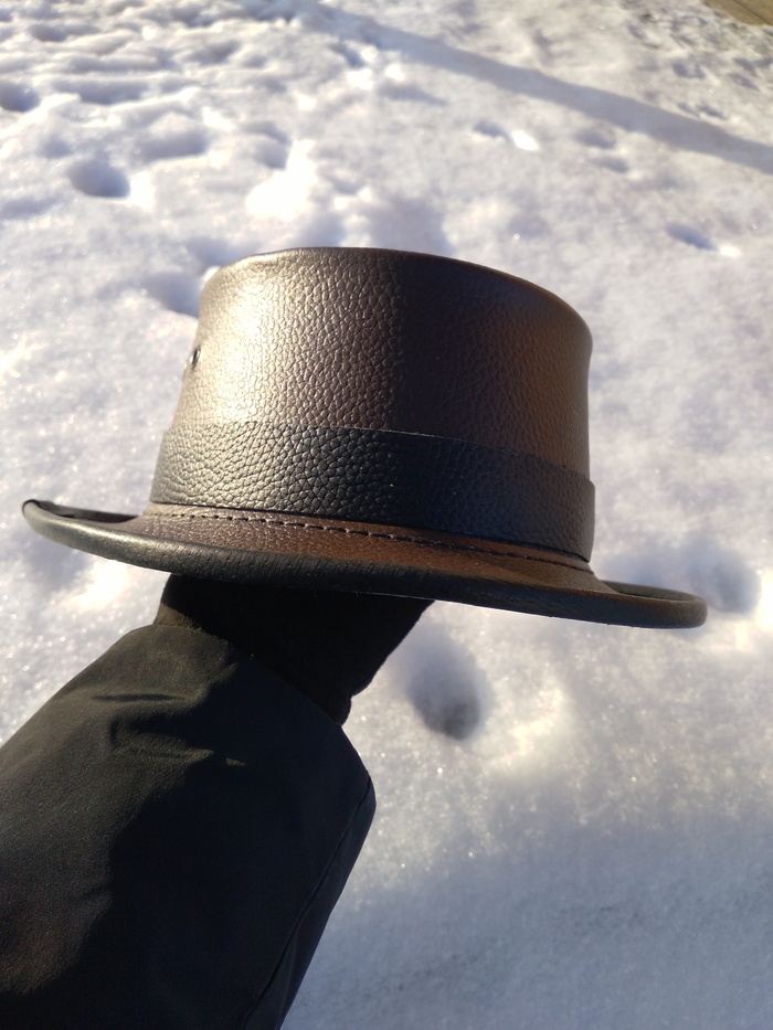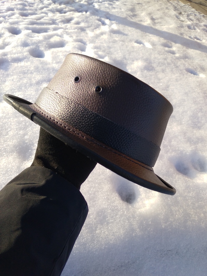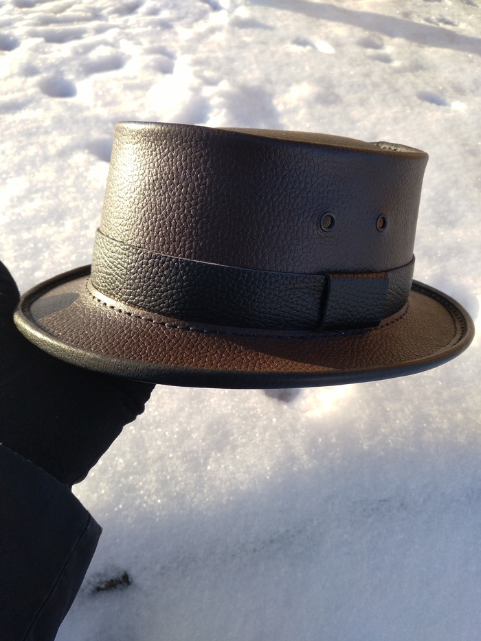 Дошила сегодня шляпу поркпай для заказчика из Питера. Человек сам выбрал кожу и прислал ее мне для пошива. Кожа двусторонний флотер, неожиданно жесткий и тонкий. Думаю, что кожа очень недорогая, ну хозяин барин, как говорится. Сшила купол и поняла, что шляпа получается очень бутафорского вида что ли, тонкая, пластиковая какая-то из-за этого полиуретана с двух сторон. Не нравится мне совсем. На день отложила пошив, думала, что предпринять. Чуть затонировала черной краской края, уже неплохо. Поля тонкущие, ужас, продублировала черной свиньей, нормально получилось. Шляпу собрала, снаружи норм, внутри пластик. Клиент без волос на голове, как представила, как лысина будет в этом пластике себя чувствовать, аж холодно стало. Сшила хлопковый подклад, благо осталось еще много ткани в запасе от предыдущего изделия , и нашила репсовую ленту по окружности головы. Вот пазл и сложился. 😊