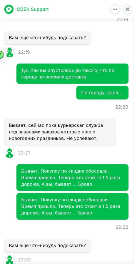 Окей, вечером пишу в СДЕК, пока еще посылка не уехала далеко. Ответ: ждите три дня, разберемся. Пишу утром, звоню. Все операторы отвечают "мы передадим кому то эту информацию, спасибо". И всё!!! Когда товар приехал в Снежинск мне звонит курьер и уточнят адрес доставки. Я говорю "Московская область... Город, СНТ... улица "..." проезд". Он обещает в течение часа привезти, подтвердив адрес доставки. Мои домашние обрадовались - мол не зря техническая поддержка свой хлеб есть. Но! Не тут то было! Через час курьер осознал чудовищную ошибку, и что 1790 км проехать за час не возможно. Сказал ничего не знаю, у меня лапки, приезжайте вы к нам за своей посылкой.