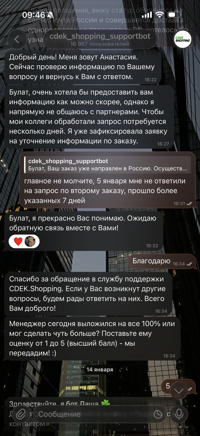 Еще конечно очень надеюсь что кто то из компании @CDEK, @CDEK.Shopping, @cdekmsk, не знаю кого еще тегнуть... Увидит пост и у него будет достаточно компетенций, чтобы признать сбой и решить мой вопрос, не подвергая меня риску остаться без посылки совсем.