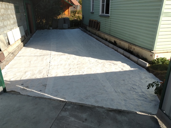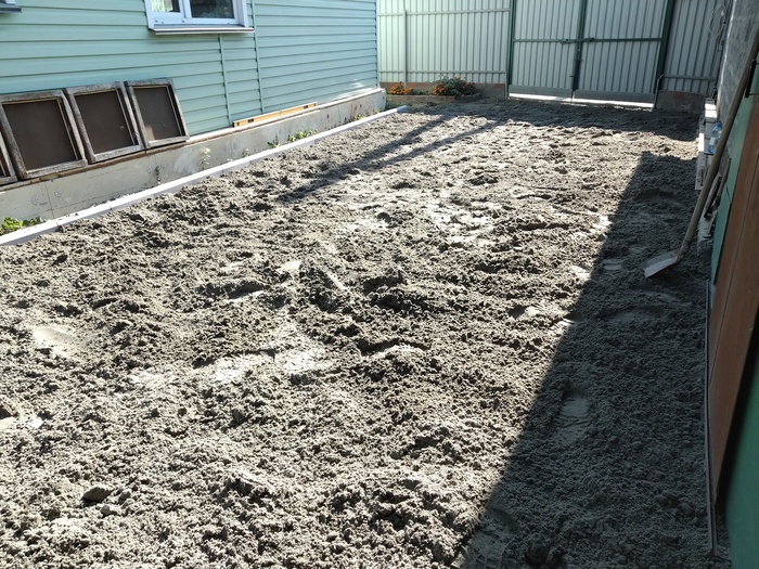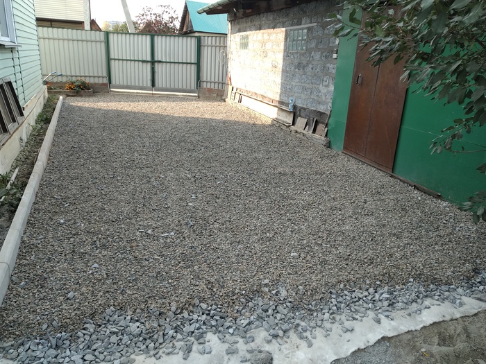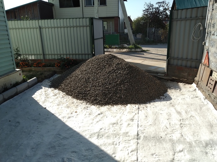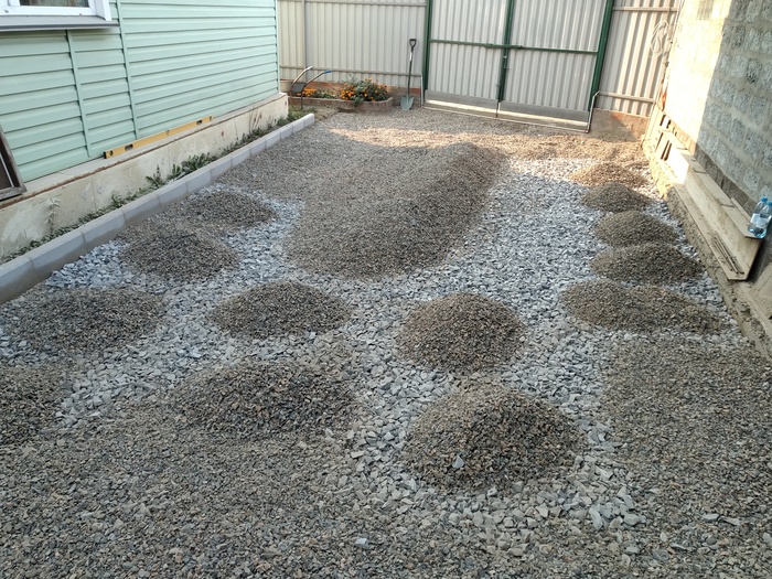 мостить брусчаткой мне показалось овердохрена сложно, да и она может по весне не ровно осесть, к тому же во двор периодически загоняем грузовички (то дров купим, то навоза) по этому хотелось более прочного основания.