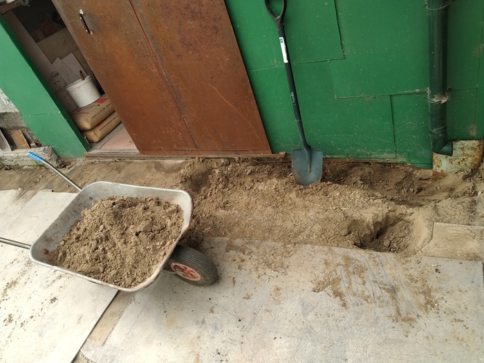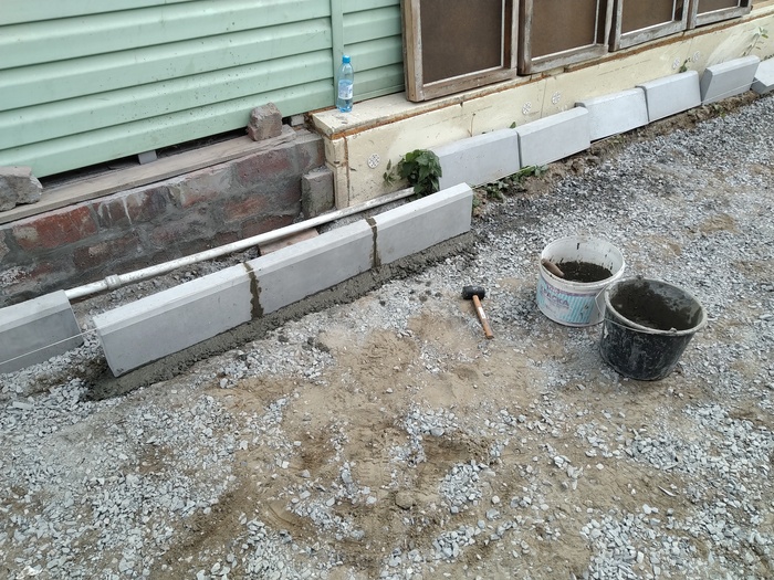 На следующий день, начинаем выкладку, я делал с уклоном от краев к центру (где желоб у меня идет), и весь желоб с уклоном в огород (закопана бочка). Еще одна сложность, что гараж (не в курсе зачем) построен не параллельно дому, разница где то в 0,5м. на всю длину, по этому делал параллельно дому.