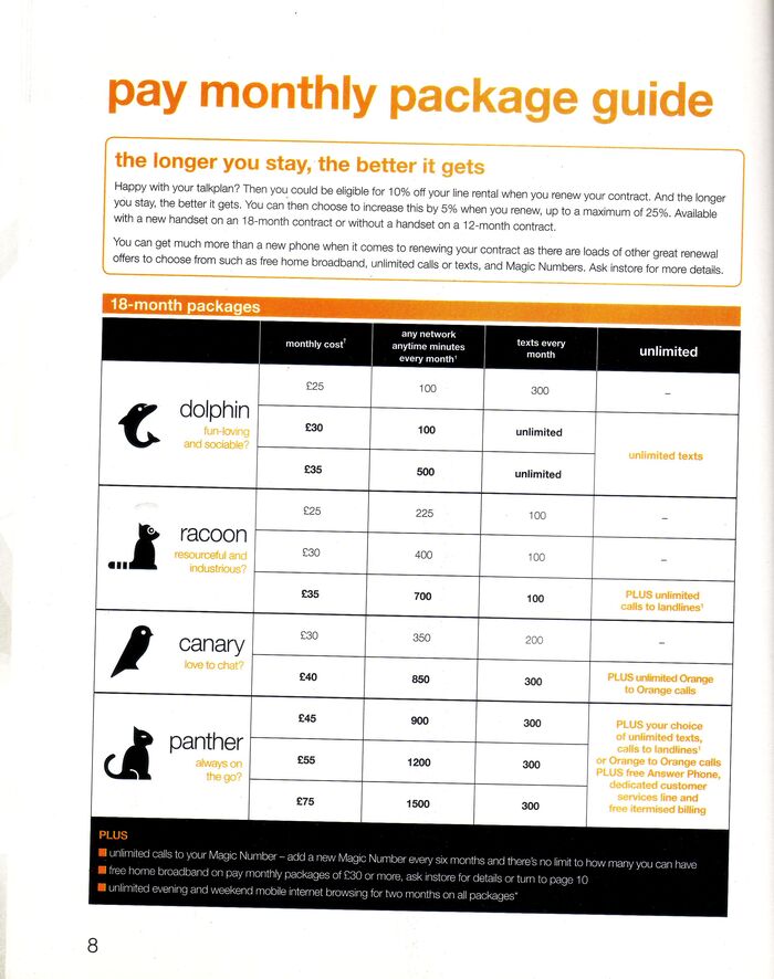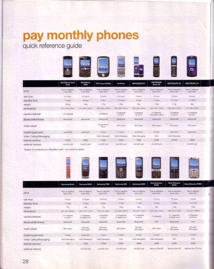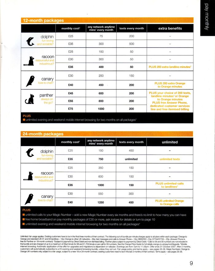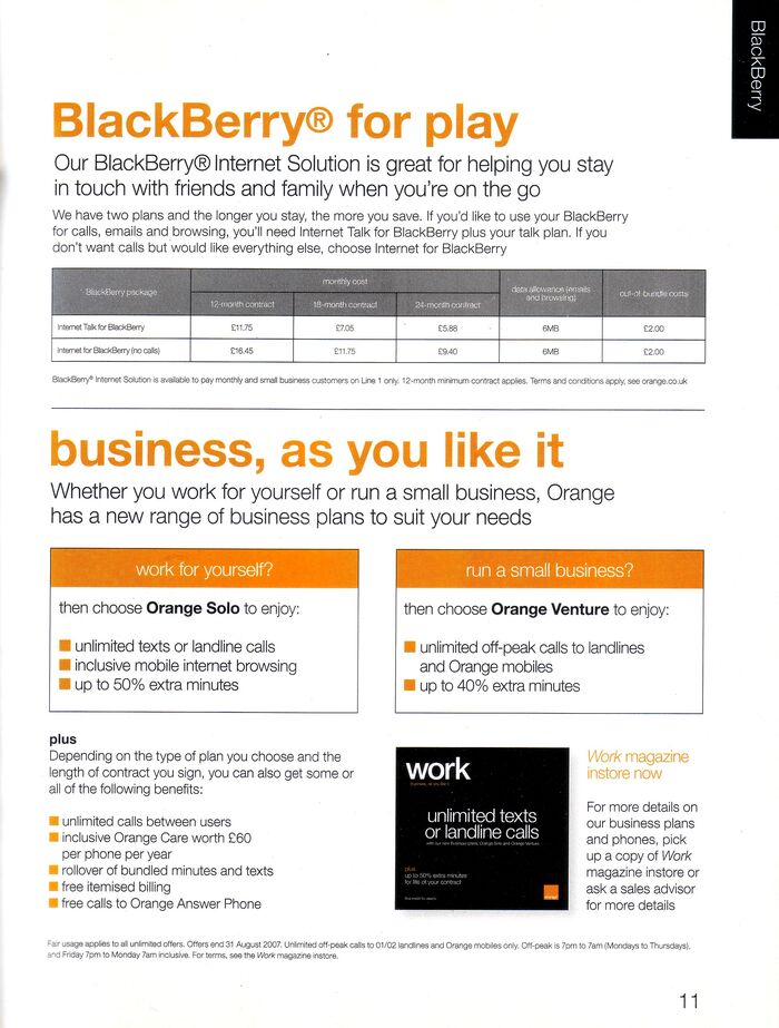На первых страницах, как и в предыдущем каталоге, представлены тарифные планы с ежемесячной абонентской платой, которая даже в ценах 2007 года "на наши" кусалась. По традиции был и тариф для Blackberry, но в отличие от o2 были полностб безлимитные звонки и СМСки. Для тех лет это круто и мечта.