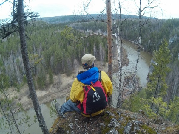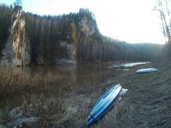 Загружаем байдарки и гребём против течения к Великану. Навстречу идут байдарки с Екб, мы с ними давеча общались по пути. Выгребаем, чалимся и идём к вершине Великана. Минут 30-40 и весь мир на ладони. Если бы не утренний снегопад было бы проще и менее грязно. Ну что уж поделаешь, коли у нас зимний сплав получился .