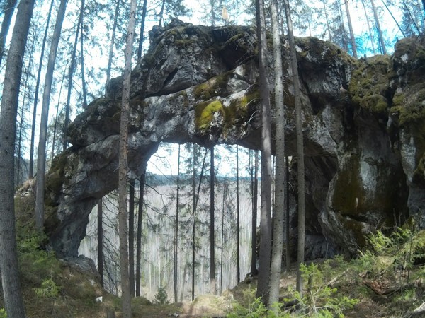 Аккуратные арки камня Дужного справа, а у следующего бойца - Новикова чалимся. Подъём не очень удобный, крутовато, да ещё и по мокрому снегу, да в резине. В скале пещера, забираемся и через узкий мокрый ход выбираемся почти к вершине. Сверху камень венчает огромная каменная арка. Ну это всё надо своими глазами видеть, но место красивенное. Хотя, через пещеру лучше с верёвкой лазить, чтобы не сверзиться ненароком. По крайней мере пока не подсохнет.