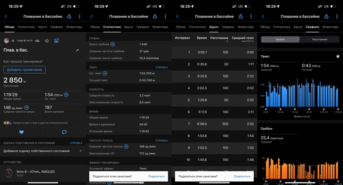 Разница в подходе к записи тренировок наглядно видна на примере одной из моих тренировок по плаванию.
