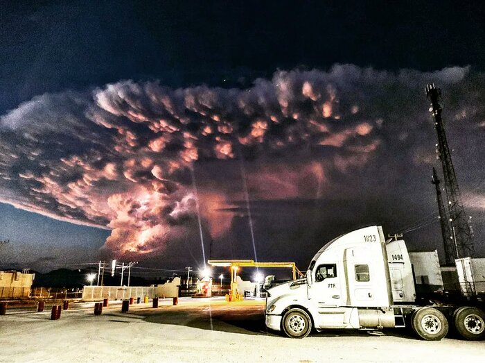 Невероятный снимок, сделанный охотницей за штормами Лорой Роу в Западном Техасе 17 мая 2021 года. Суперячейка грозы, освещенная заходящим солнцем на разной высоте.
