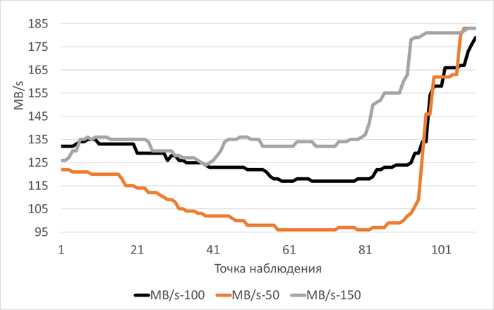 Пропускная способность (MB/s) монотонно растёт: 116,1 (50) → 129,6 (100) → 137,5 (150)