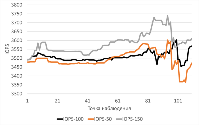 IOPS также увеличивается: 3 490 (50) → 3 513 (100) → 3 570 (150)