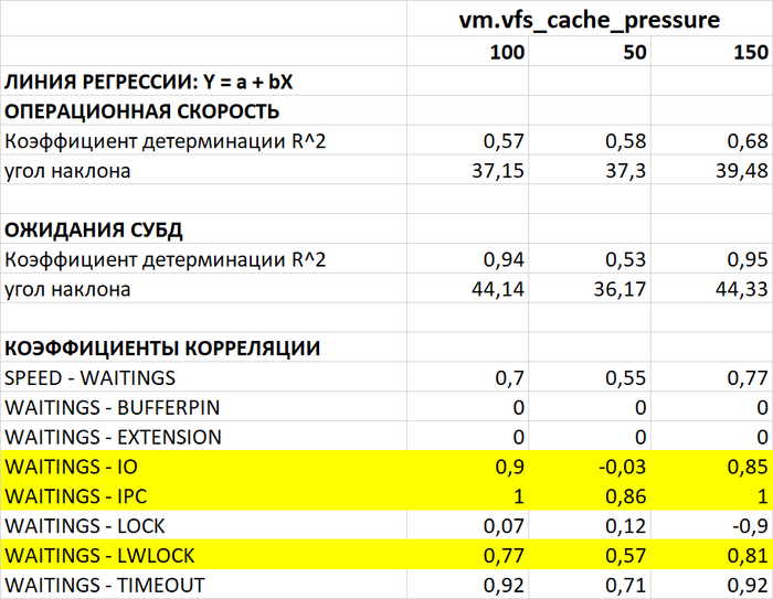 · При vfs_cache_pressure=100: R²=0,03, угол наклона 10,38 (норма)