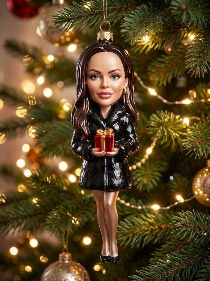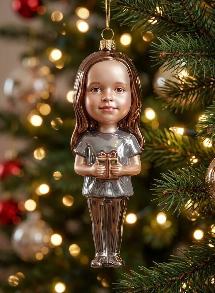 Главный объект: «Высокодетализированная стилизованная фигурка-елочная игрушка человека с загруженного фото, выполненная как премиальный коллекционный новогодний украшение. Фигурка сделана из выдувного стекла с глянцевым лакированным покрытием, с гладкими блестящими поверхностями и богатыми зеркальными бликами». Сходство и стиль: «Точно воспроизведи черты лица человека, прическу и цвет волос, общее сходство с фото. Легко стилизуй лицо в очаровательной, слегка карикатурной манере, в духе дизайнерских арт-игрушек. Голова чуть увеличена для милой, классической пропорции елочной игрушки». Сцена и атмосфера: «Игрушка висит на пышной, красиво украшенной новогодней елке. Создай теплую, праздничную атмосферу с мягким, сказочным новогодним освещением, которое красиво отражается на стеклянной поверхности. На заднем плане - расфокусированные огни гирлянд и украшений, создающие мягкий, красивый боке-эффект. Фигурка обрамлена четко прорисованными иголками и ветвями елки, на которой она висит». Стиль и качество: «Фотореалистичный 3D-рендер, студийное качество, резкий фокус на фигурке. Изображение должно быть в разрешении 8K и передавать ощущение волшебной, уютной и премиальной рождественской коллекционной игрушки