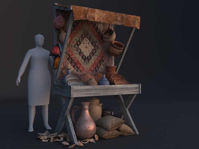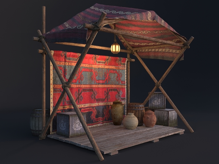 В прошлом посте была задета тема наполнения сцены, в частности торговой площади у восточных ворот Балморы. Палатки поедут туда, делала по референсу из сети.Нам наполнением двух полупустых надо подумать, вообще у меня с этим сложности, придумать чего насовать в торговую площадь, но так чтоб не мелко было. Не нашла текстуру для тарелок, пришлось нарезать скриншотов с сайта торгующего керамикой, остальное допилила в фотошопе. Ткани - Marvelous Designer. Модельки хайполи, лоуполить это все еще предстоит, но с современным костылями это не проблема, думаю.
