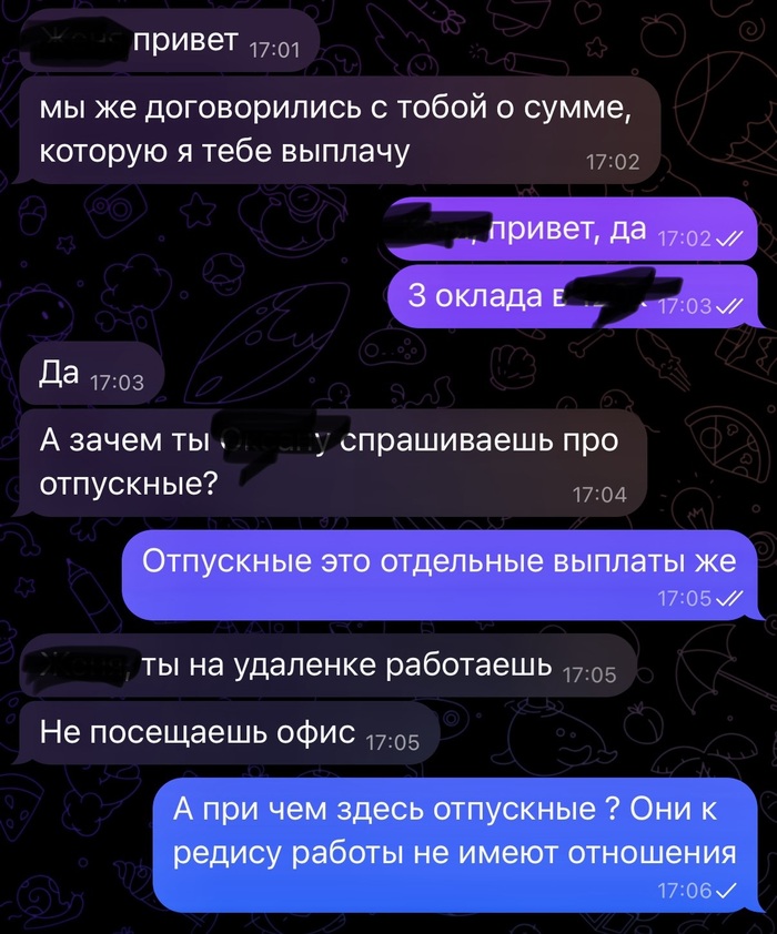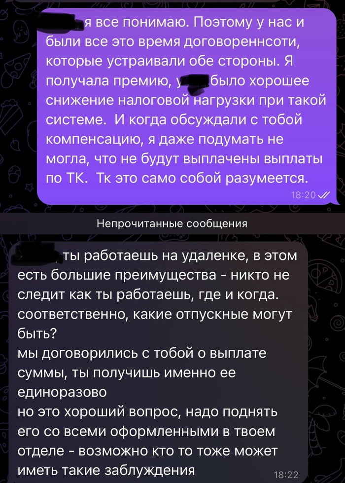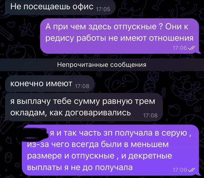 Я сказала ок, но давай договоримся о компенсации в 3 оклада. Сумму мы согласовали. Когда дело дошло до передачи дел, меня попросили еще на неделю остаться, тк обьем был не маленький. Ок я согласилась. Параллельно списалась с бухгалтером, чтобы она готовила доки мне на увольнение. Расходится решили по соглашению сторон, всех все устроило.