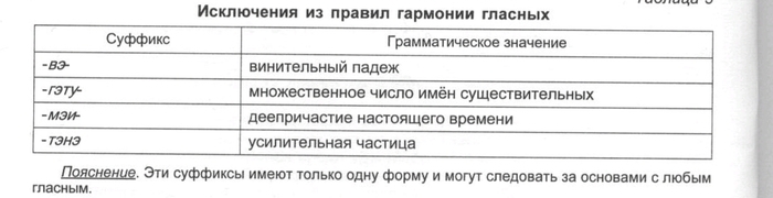 Эти суффиксы имеют только одну форму и могут следовать за основами с любыми гласными.