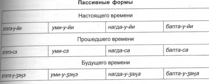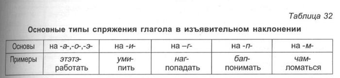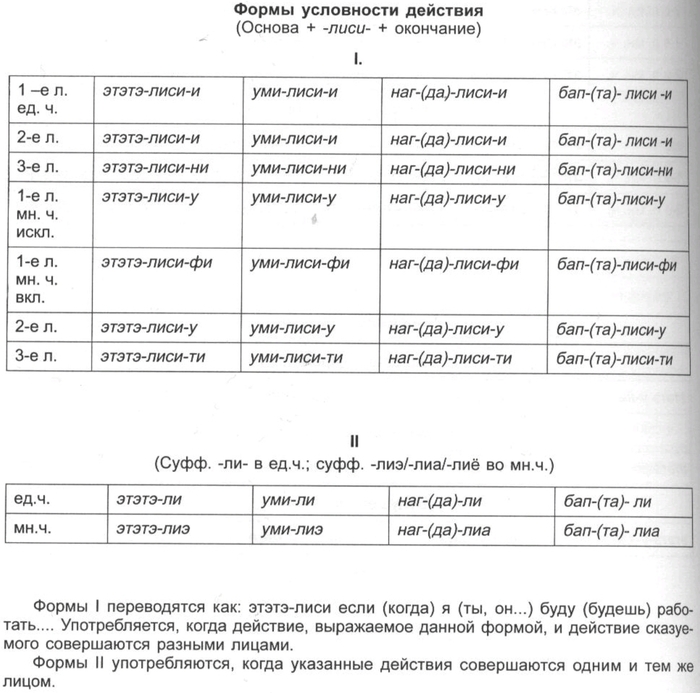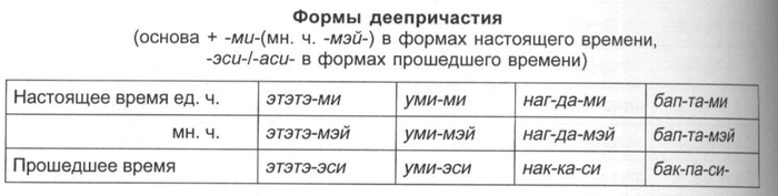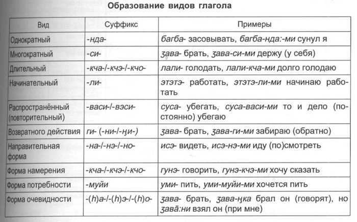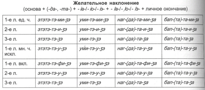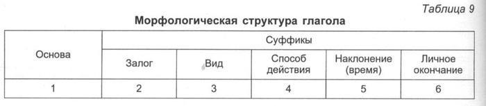 Пояснения. Таблица показывает, в каком порядке должны следовать друг за другом суффиксы в глагольных словоформах. Практически к основе присоединяются лишь различные комбинации суффиксов, но при этом должен соблюдаться общий порядок соответствующих показателей.