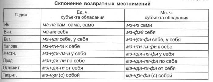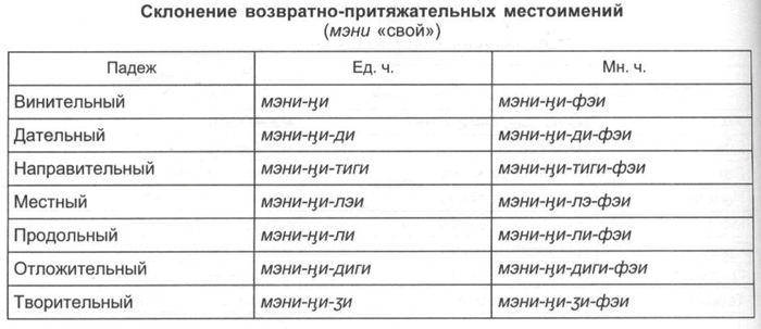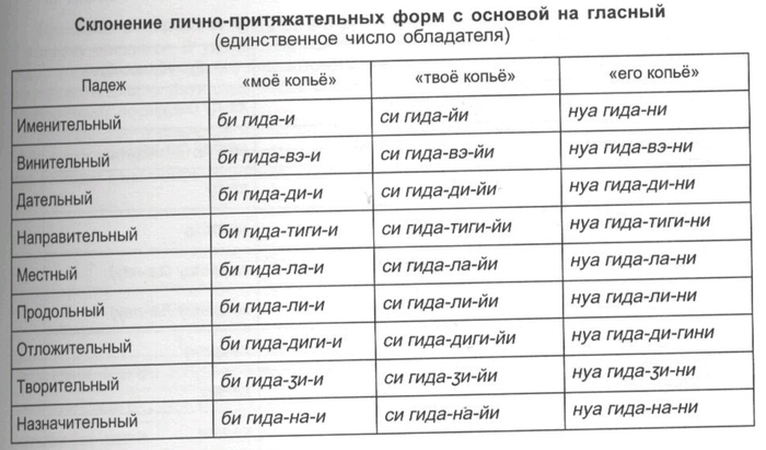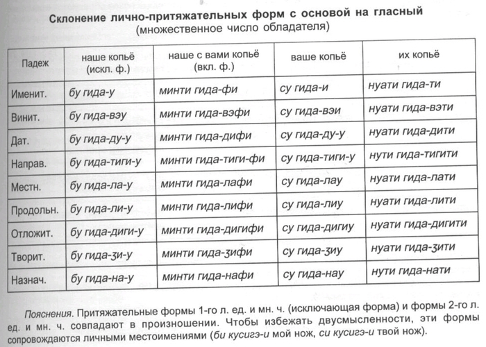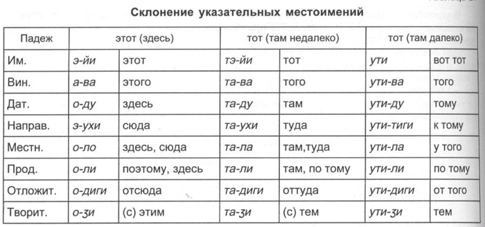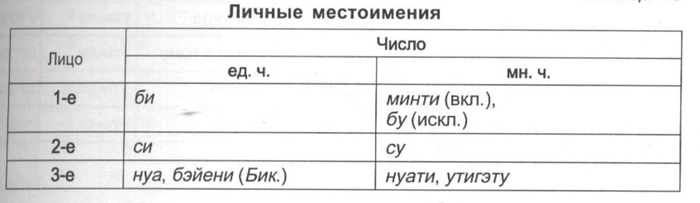 Для первого лица множественого числа личных местоимений различаются включающая формы, когда речь идёт о всех присутствующих или участвующих в каком-либо действии (минти мы с тобой, с вами), и исключающая форма, имеющая в виду только часть действующих лиц (бу мы без тебя, без вас). По степени близости подразумеваемого предмета различается указание на более близкий предмет (тэйи тот, там (недалеко)) и более далёкий (ути тот, там (далеко)).