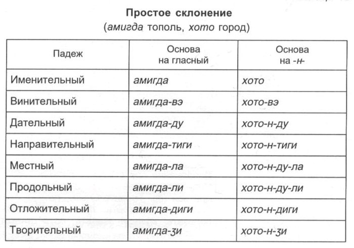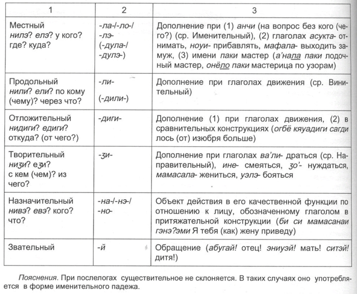 «склоняемый» послелог. Большинство послелогов является притяжательными формами косвенных падежей существительных и образуется от соответствующей (именной) основы, а часть из них восходит к наречиям. Значения существительного, наречия и послелога часто пересекаются.