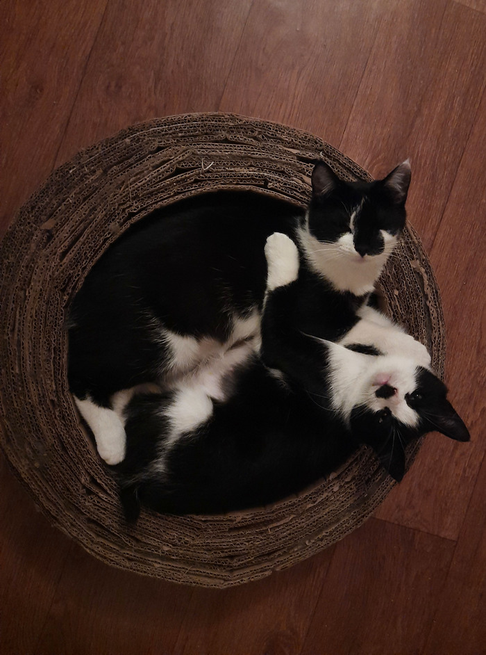 И очень полезной вещью оказались картонные лежанки-когтеточки. Коты постоянно в них отдыхают, а самая милота, когда в одной лежанке в обнимку лежат котейки-сестрички)