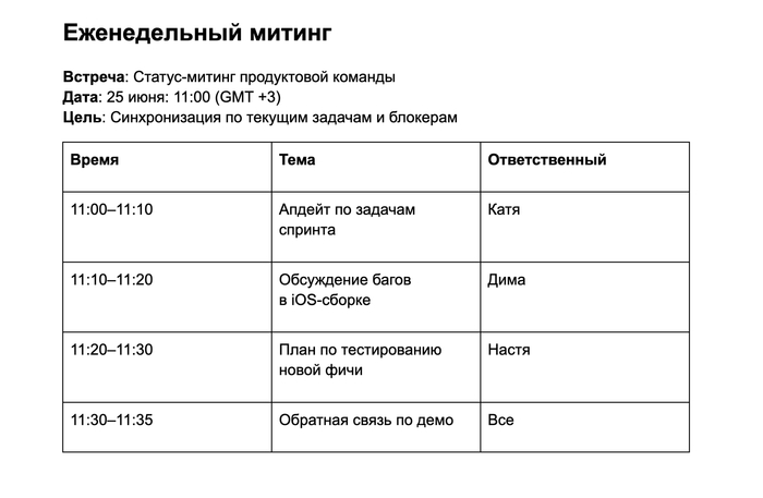 Чтобы созвоны не превращались в бесконечную болтовню, мы советуем перед каждой встречей составлять адженду. Это такой план встречи, где фиксируется:
