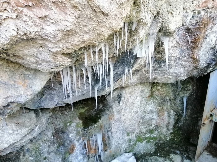 Перед входом в пещеру - сосули. Снаружи - холодный ветер, а внутри постоянная температура, +10. Говорят, там какая-то особая атмосфера, ни грибков, ни микробов нету, сплошное здоровье и счастье.