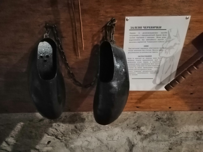 А на пятке этих железных туфелек - острые шипы. Долго стоять на цыпочках человек не мог и постепенно прокалывал себе пятки