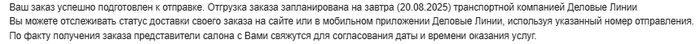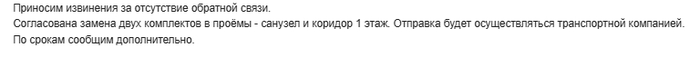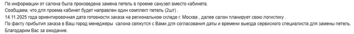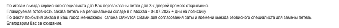 Дальше назначили срок поставки петель для всех 3-х дверей 04.07.25 + доставка ко мне в город