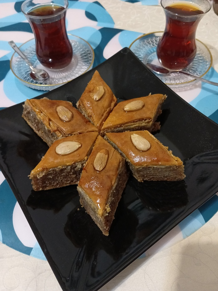 Двенадцать слоëв дрожжевого теста, пересыпанных дроблëными грецкими орехами с сахаром и кардамоном, пролитых топлëным маслом и залитых сиропом с лимоном и шафраном.