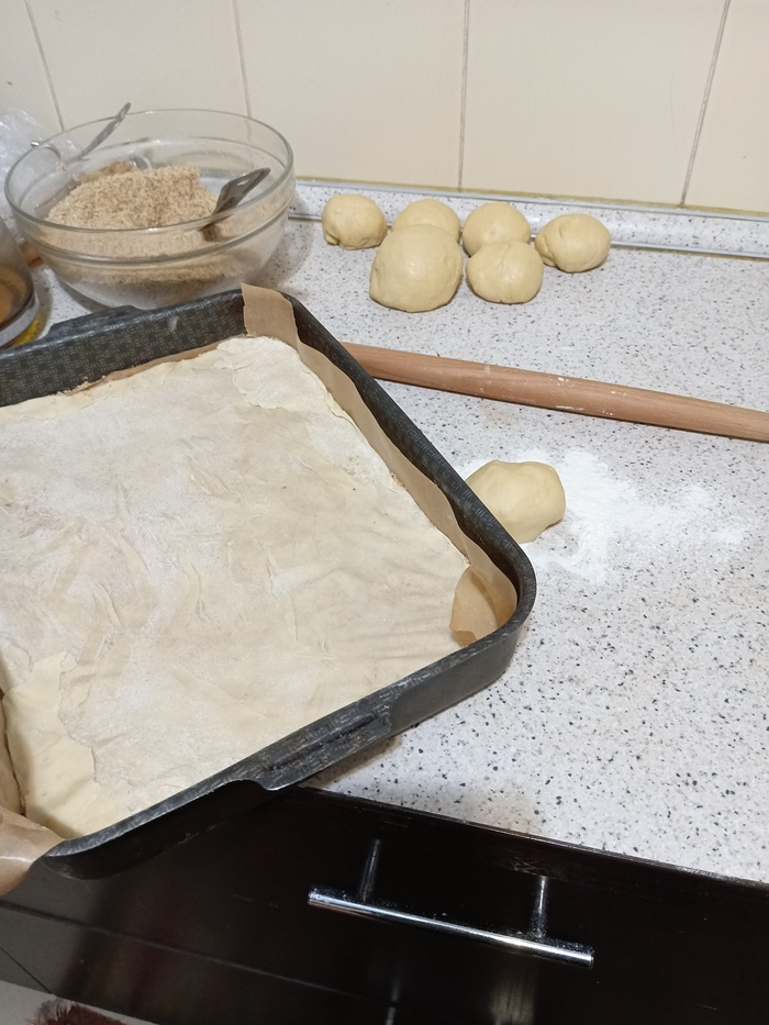 Вытаскиваем. Взвешиваем тесто. Сколько получилось делим на 14 кусков. Потом два куска кладëм на другие два куска, должно получится два больших и десять маленьких колобков. Из двух больших щипаем с одного кусок и накидываем к другому, надо чтобы из двух больших получилось так, чтобы один был больше другого. Смазываем форму для выпечки сливочным маслом. Раскатываем первый колобок( один из двух больших, который меньше), расстилеам на форме, смазываем топленым маслом. Стелим на него раскатанный маленький колобок, на этот слой уже сыпем начинку, рассчитывайте так чтобы начинки хватило на все слои.