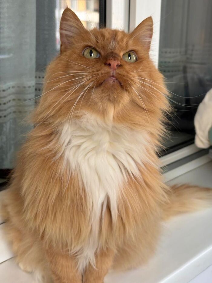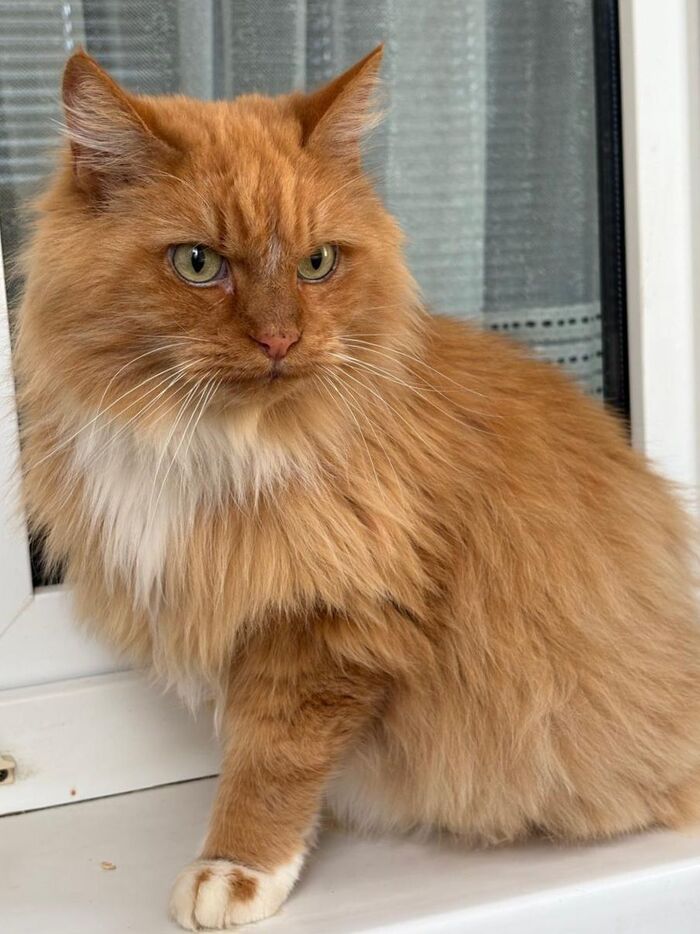 Донне лет 5, она стерилизована, к людям очень ласковая. Большущая, красивая, ярко-рыжая со звездочкой во лбу.