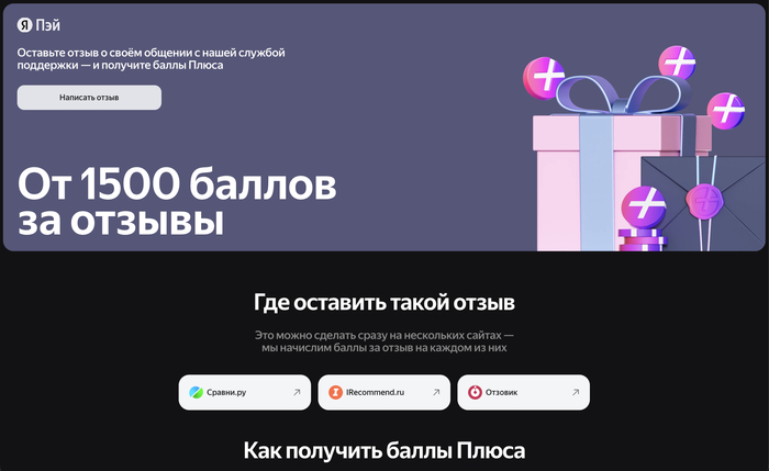 Яндекс запустил акцию "баллы за отзывы": можно оставить отзыв на одном из указанных ресурсов и получить 500 баллов. Доказательство существования акции вот: https://pay.yandex.ru/otzoviki