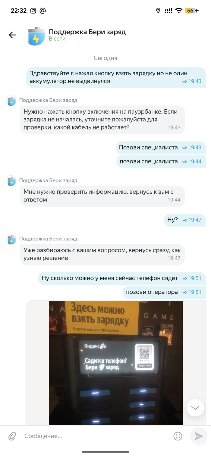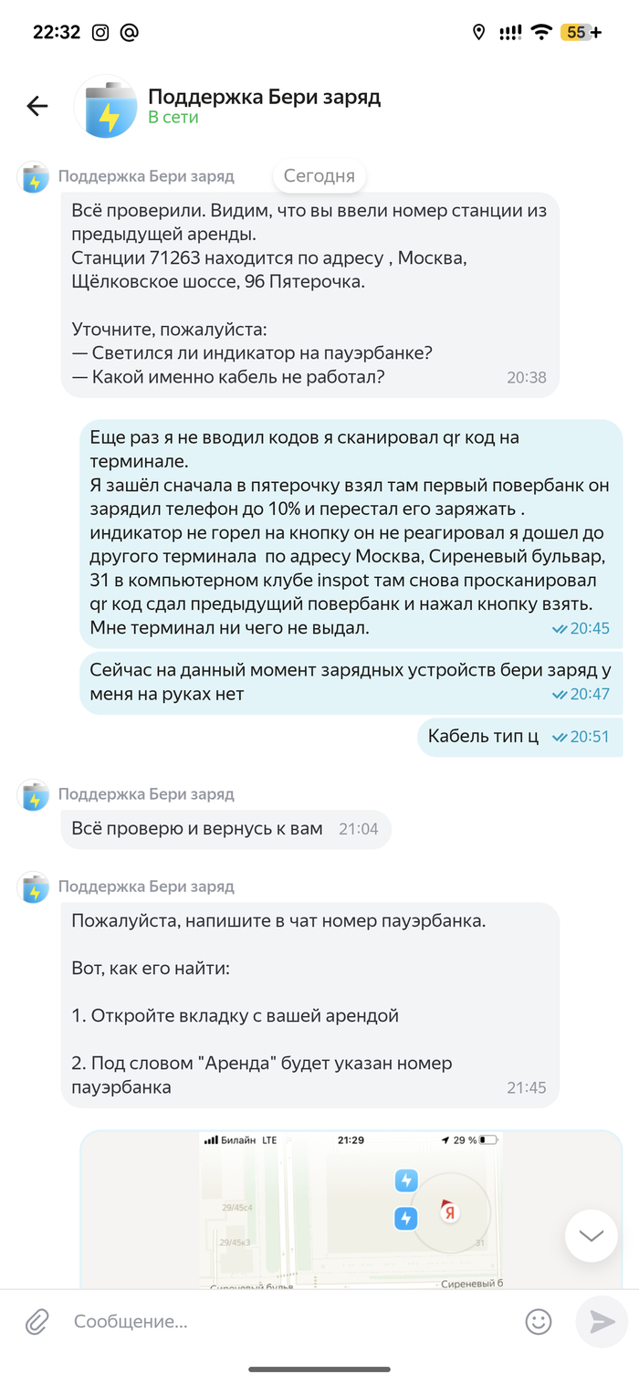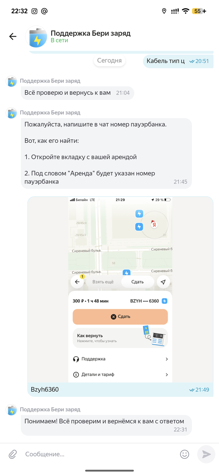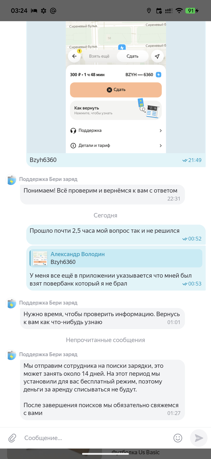 Прошло два с половиной часа. Я уже домой доехал, чай выпил. В приложении до сих пор висит, что у меня аренда пауэрбанка, которого у меня нет. Я им пишу — они снова: «Нужно время, чтобы проверить информацию».