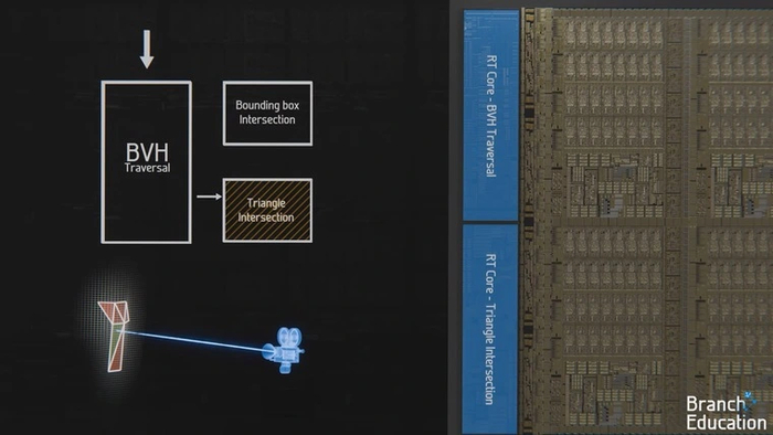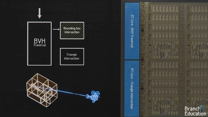 Внутри RT-ядер находится два вычислительных движка. Первым начинает работу движок, занимающийся поиском пересечений лучей с объемами-коробками BVH.