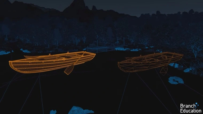 Положение каждой коробки в пространстве выровнено строго по осям координат. Когда луч начинает свое путешествие из точки, его направление сравнивается с координатами первой пары больших коробок. Коробка, которую он не пересекает, исключается из расчетов — как и все более мелкие, на которые она поделена.