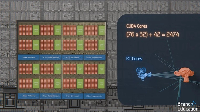 Несмотря на все ухищрения, для быстрых расчетов трассировки все также требуется мощное вычислительное оборудование. Поэтому видеокарты, поддерживающие ее, оснащаются тысячами шейдерных процессоров и специализированными вычислительными блоками — RT-ядрами.