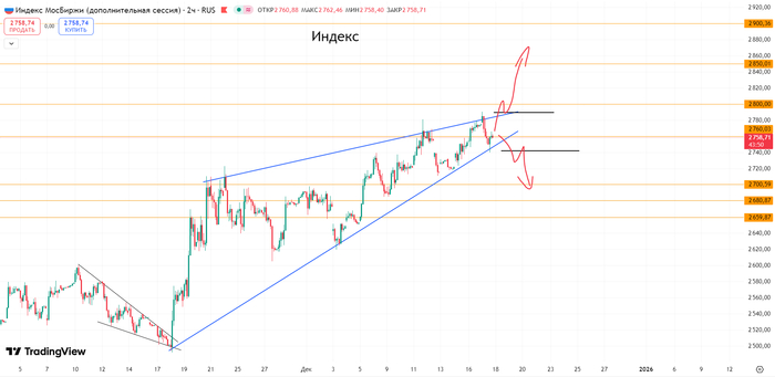 🔸Индекс $IMOEXF 2ч. На графике клин. Для лонга нужно пробивать 2800, после чего возможен рост к 2850-2900. Шорт в случае пробоя 2740,тогда буду ждать 2700-2680-2660. На возможном откате увеличу позиции, в случае сценария с ростом-добор.