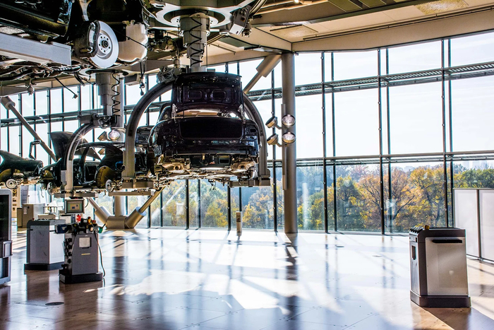 Стекла в пол, паркетная доска на полу, великолепные виды. Все это создавалось под производство представительского VW Phaeton. Который, как известно, провалился на рынке.