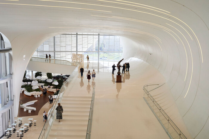 Азербайджан активно работает над имиджем и создает достопримечательности. Одна из них – Центр Гейдара Алиева, построенный по проекту Захи Хадид. Само её имя привлекает туристов, а фотографии тем более. Округлые органические формы, которые редко используются в архитектуре из-за дороговизны и сложности в эксплуатации, из-за этого эффект от практически полного отсутствия прямых линий становится еще сильнее.