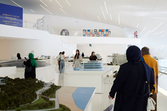 Здание впечатляет не только нестандартной архитектурой, но и своими размерами – его внутреннее пространство превышает 10 гектаров, что в четыре раза больше Красной площади. К сожалению большая часть пространства не используется, либо закрыта для посетителей, а оставшаяся часть вызывает вопросы. Несколько залов отведено под культуру Азербайджана: ковры, музыкальные инструменты, национальные костюмы и другое. Также часть экспозиции посвящена бывшему президенту Азербайджана, в честь которого и создали центр.
