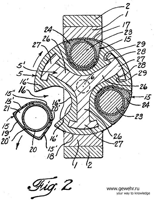 Впрочем, существовал даже более радикальный путь увеличения кучности при сохранении плотности огня – залповая стрельба сразу из нескольких стволов. И хотя в некоторых русскоязычных источниках говорится, что H&R SPIW обладала тремя стволами, скорее всего, это неточность. Здравый смысл, имеющиеся изображения, конструкция патрона и один из патентов подсказывают, что ствол все-таки был один, но трехканальный.