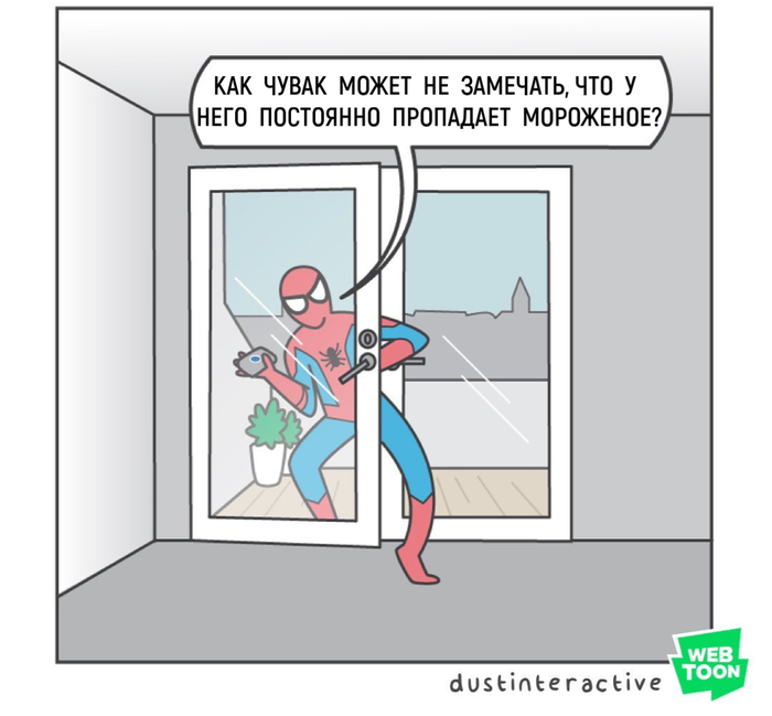 Название комиксов “Dust Interactiveс”, можно перевести как “Интерактивная пыль”. Хотя никакой пыли художник изначально не имел ввиду, просто его зовут Дастин Роджерс, на английском Dustin Rogers и если обрезать его имя, то получается забавная игра слов. Такой брендинг не только забавный, но и запоминающийся и зачастую художники обыгрывают свое имя в названии, чтобы выделяться.
