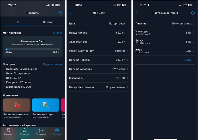 Дальше идёт выбор пола, дата рождения, рост и тип активности по образу жизни, но нет учета тренировок, что для меня минус. Затем у вас спросят желаемую цель веса, после красиво покажут ваши возможные результаты, рассказав как всё будет чики пуки, и плавно подведут к покупке подписки. Дальше в посте я отдельно отмечу, какие функции доступны с платной подпиской.