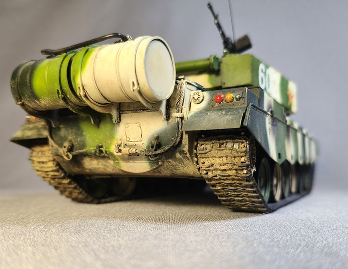 Представлена модель ZTZ 96A в устаревшем трёхцветном камуфляже НОАК со стандартной однопальцевой гусеницей и установленными внешними топливными баками, 2010-е годы, КНР. Модель фирмы Hobby Boss, масштаб 1/35.