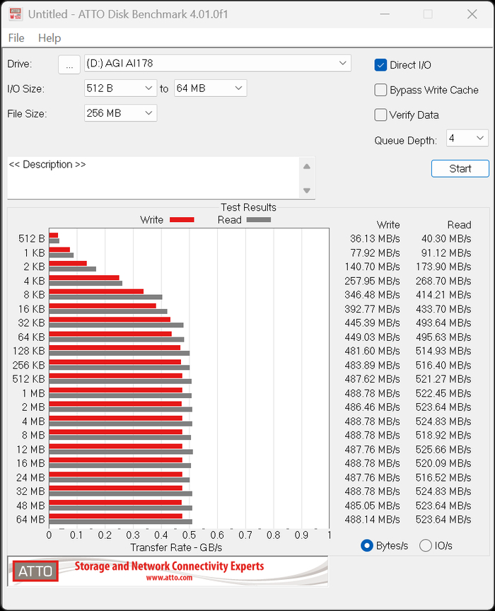 Основные показатели скорости при тестировании утилитoй ATTO Disk Benchmark. Общие значения 520МБ/с и 488 МБ/с, что ближе данным со страницы продукта DNS.