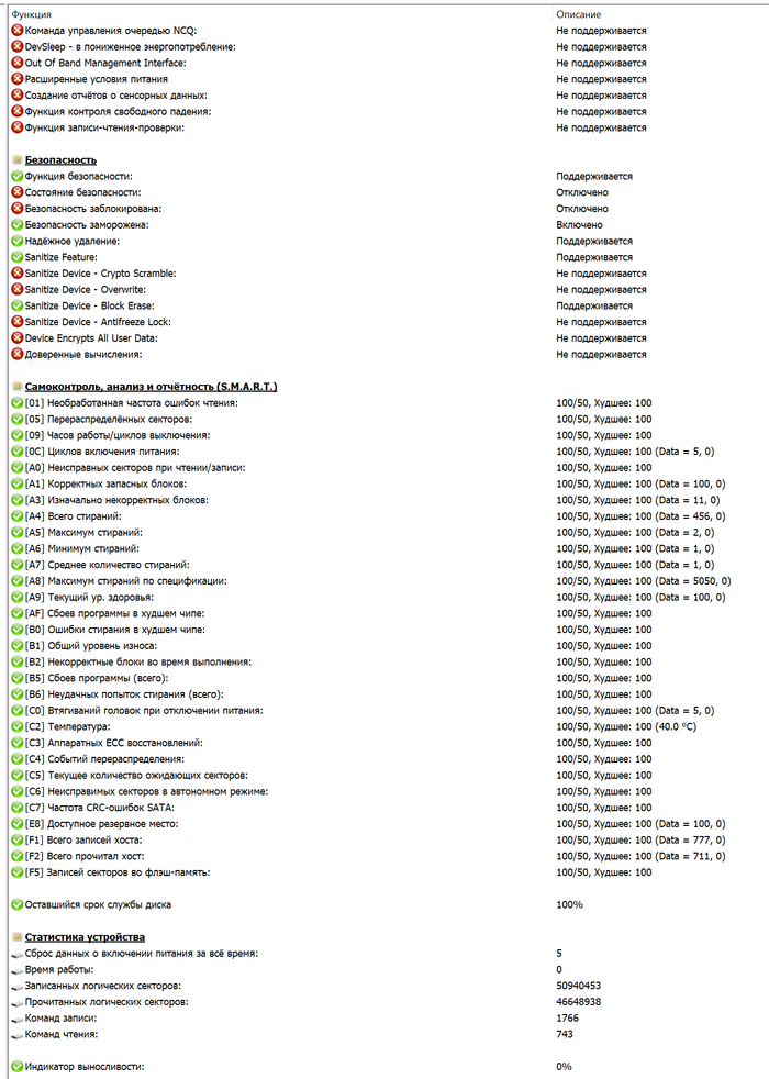 На первом этапе посмотрим основные характеристики и параметры исследуемого твердотельного накопителя программой CrystalDiskInfo.