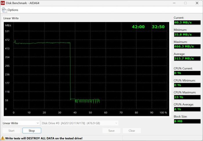 Далее следует линейная запись AIDA64 на весь объем. Первые 36% объема ускоренного SLC-кэширования показатели стараются быть идеальными, а дальше мы наблюдаем обычную картину: для нашей версии SSD с текущей прошивки скорость падает до 40 МБ/с.