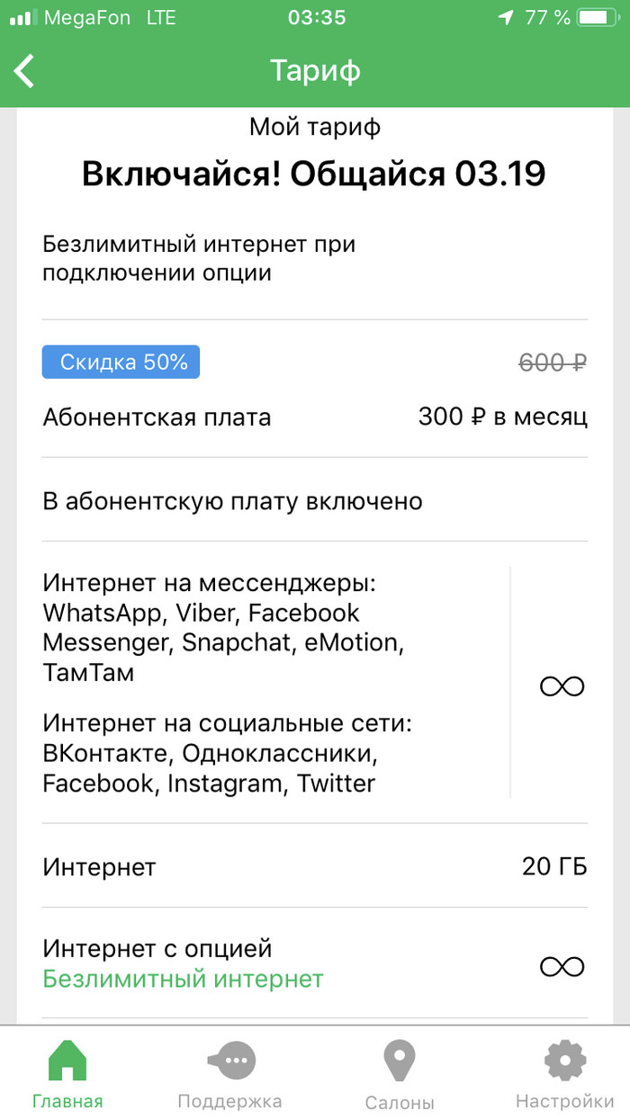 В целом, у меня сложилось не самое приятное впечатление о зелёном опсосе и пропало всякое доверие к нему. Подобные вещи не должны иметь место. Мегафон предложил искупить свои грехи тарифом с безлимитным инетом за пол цены при моей попытке бегства с переносом номера в теледвоечку, к чему я отнёсся довольно скептически но решил попробовать. И не обманули.
