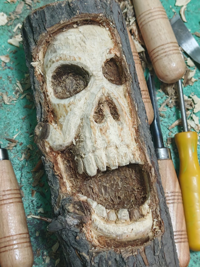 Занятие оказалось весьма увлекательным! Воспользовался сучком, чтобы сделать торчащую скулу. Для второй скулы сучка не было, спрятал ее под кору, как будто череп выглядывает из под нее. Вообще кора мне нравится, хотел ее сохранить и как-то это обыграть. А ещё вяз хорош своей темной сердцевиной - внутри рта и глаз потемнение здесь как раз в тему.